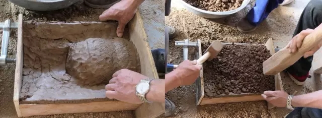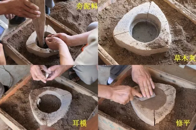 夯范:將模固定好,表面撒上一層黑煙灰做脫模劑,填入泥料層層夯實(shí),脫模后修整,陰干即可。