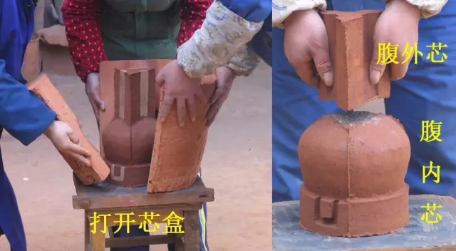 打開(kāi)外范,去掉耳模,即得兩個(gè)完整的泥芯,將范面的泥片去除,這時(shí)范和芯之間就會(huì)形成型腔。
